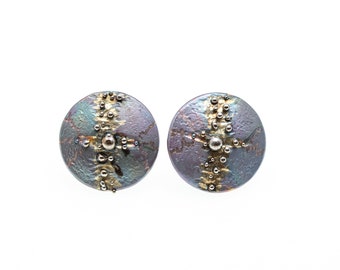 Island Volcan. Titanium Textured Circle Studs. Hypoallergenic. Bio compatible. Anodizing and Welding. Unique piece. Handcrafted in Finland
